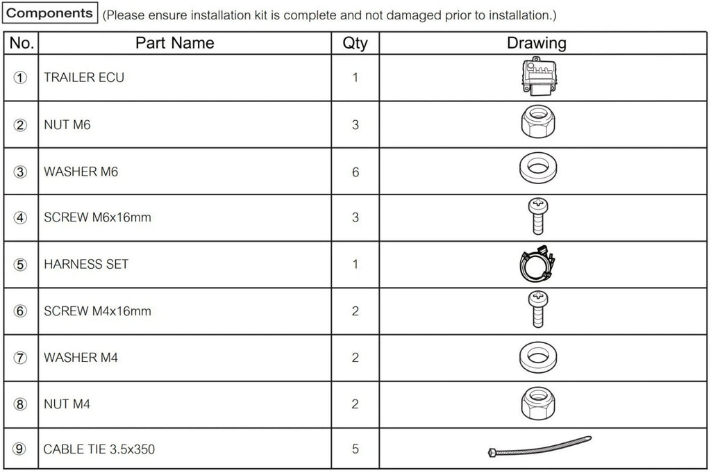 Wiring harness kit only (including tow bar ECU), please see component list picture for all parts included with this wiring harness kit.