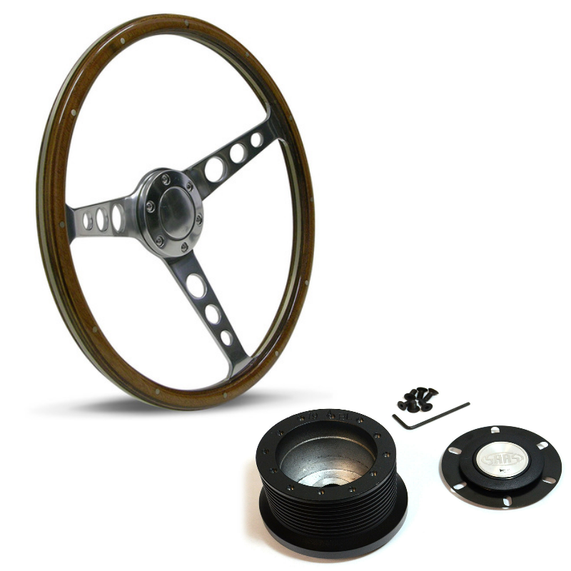 SAAS Steering Wheel Wood 15" Classic Polished Alloy Holes + Rivet & Boss Kit