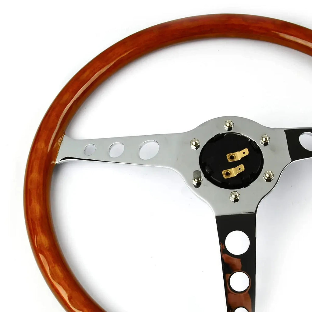 This beautifully crafted 15’’ SAAS woodgrain steering wheel will give your pride and joy the ultimate classic look. Featuring laminated wood finish surrounding three chrome spokes, this steering wheel will be the centerpiece of your interior.
