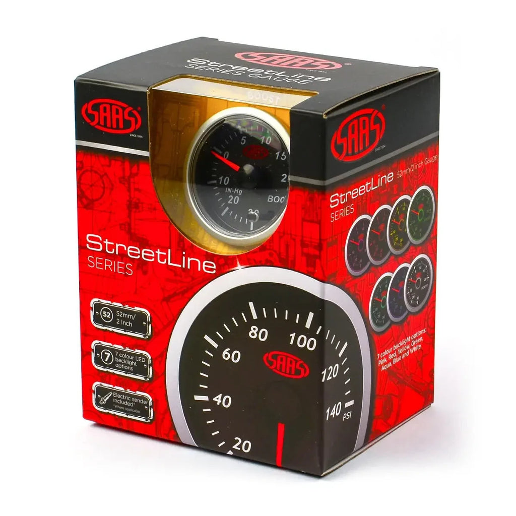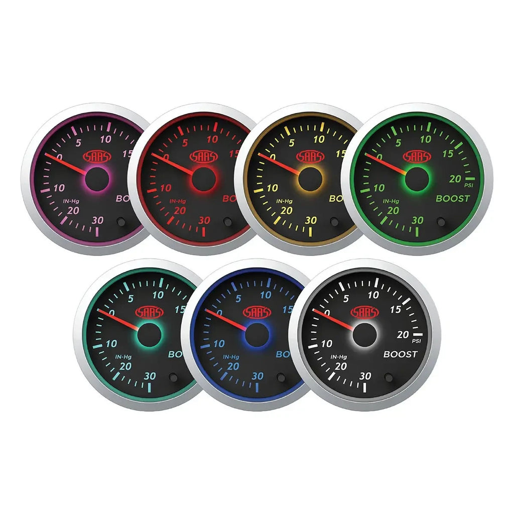 SAAS Streetline Series Boost 52mm 2in 30 IN-HG>20 PSI Gauge Black Face 7 Colours